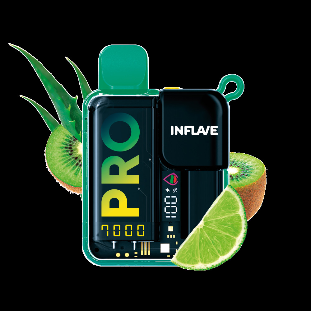Электронная сигарета Inflave Pro 7000 затяжек Киви Лайм Алоэ. Зеленый коктейль, который точно сможет освежить, взбодрить и удивить. Спелое, сочное, сладковатое киви, характерная уникальная кислинка лайма и своеобразный травянистый вкус мякоти алоэ.